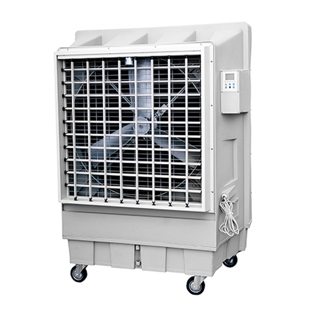 Il raffrescatore evaporativo portatile WM30 è provvisto di quadro di controllo LCD, telecomando, scarico manuale dell'acqua e sistema di carico acqua a galleggiante.